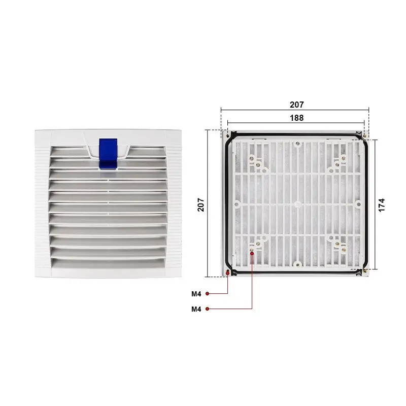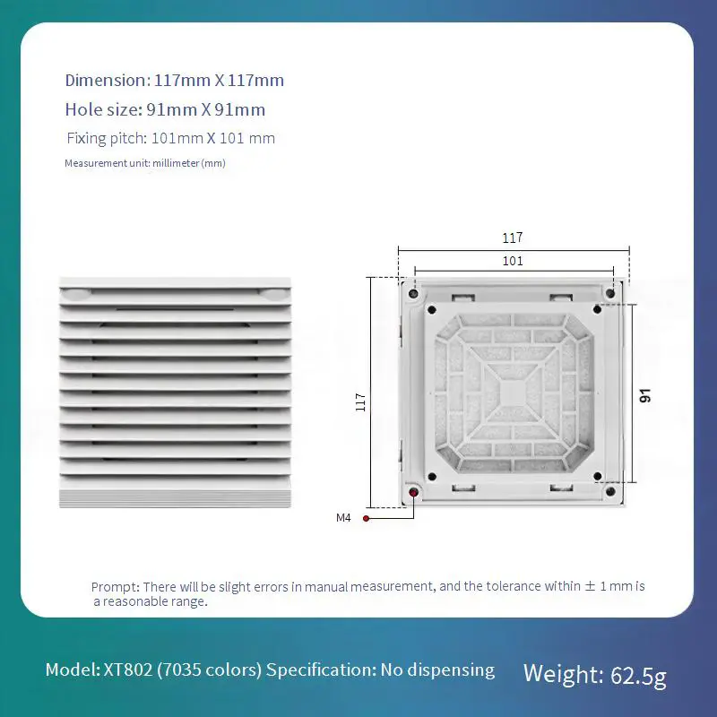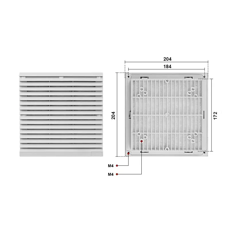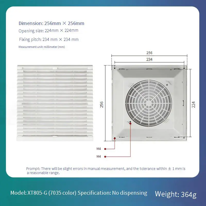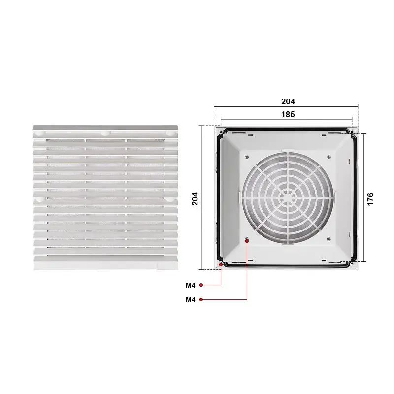 কুলিং ফ্যান ডাস্ট কভারটি এবিএস প্লাস্টিকের তৈরি এবং চারটি স্ট্যান্ডার্ড রঙিনওয়েতে পাওয়া যায়: 7035 হোয়াইট গ্রে, 7032 বেইজ, সাদা এবং কালো। আমরা বিতরণকারী এবং অ-বিতরণ উভয় সংস্করণও সরবরাহ করি, বিতরণটি কালো হওয়ার সাথে।