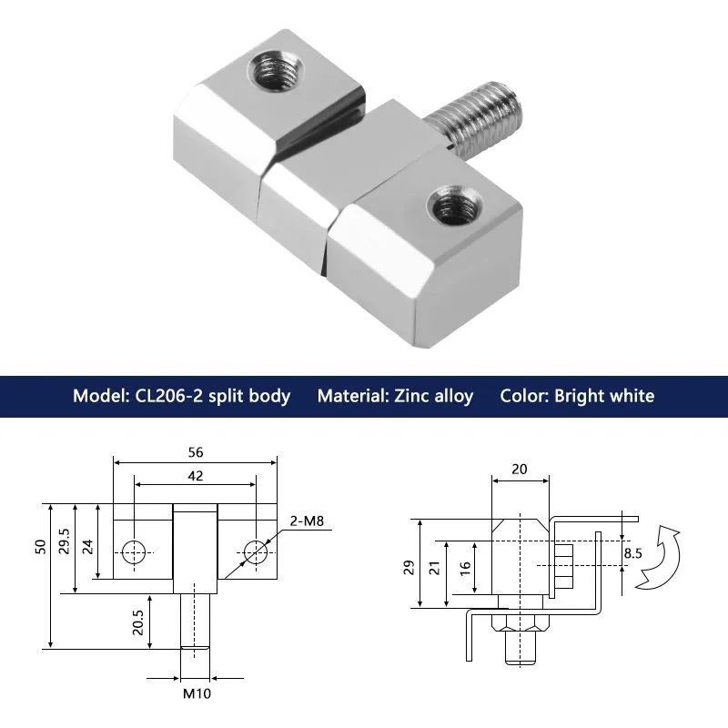 বৈদ্যুতিক শিল্প মন্ত্রিসভা অপসারণযোগ্য CL206-1 হিংজ হ'ল জিংক অ্যালোয় দিয়ে তৈরি একটি পিস কব্জা, যা উজ্জ্বল সাদা (ক্রোম-ধাতুপট্টাবৃত), কালো এবং নীল (স্প্রে) এ উপলব্ধ এবং বাম এবং ডান দিকগুলিতে বিভক্ত। সিএল 206-2 একটি বিভক্ত কব্জি যা লোহার ধাতুপট্টাবৃত উজ্জ্বল সাদা এবং ব্রাশযুক্ত স্টেইনলেস স্টিলের মধ্যে পাওয়া যায়।
