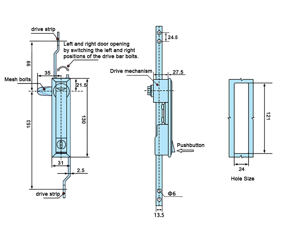 স্টেইনলেস স্টিলের দরজার লকটি স্থায়িত্ব এবং জারা প্রতিরোধের জন্য মূল স্টেইনলেস স্টিলের রঙে স্টেইনলেস স্টিল দিয়ে তৈরি। খোলার আকারটি 24 মিমি × 121 মিমি, স্ট্যান্ডার্ড ইনস্টলেশন কনফিগারেশনের সাথে সামঞ্জস্যতা নিশ্চিত করে।