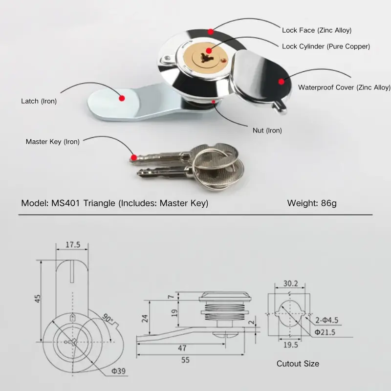 লক ফেসটির ব্যাস 39 মিমি, এবং ওয়াটারপ্রুফ কভারটি 90° ঘোরে।